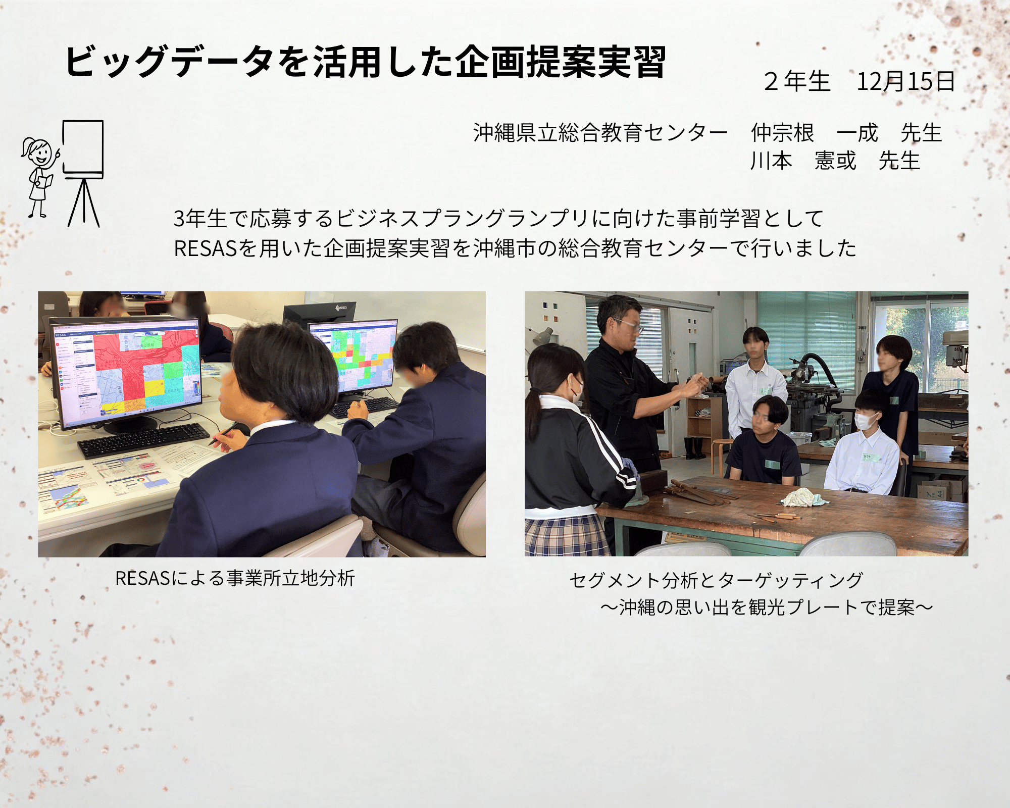オフィスクリエイト科2年生は、12月15日、次年度に応募するビジネスプラングランプリの事前学習としてビッグデータ(RESAS)を活用した企画提案実習を沖縄県立総合教育センターにて行いました。